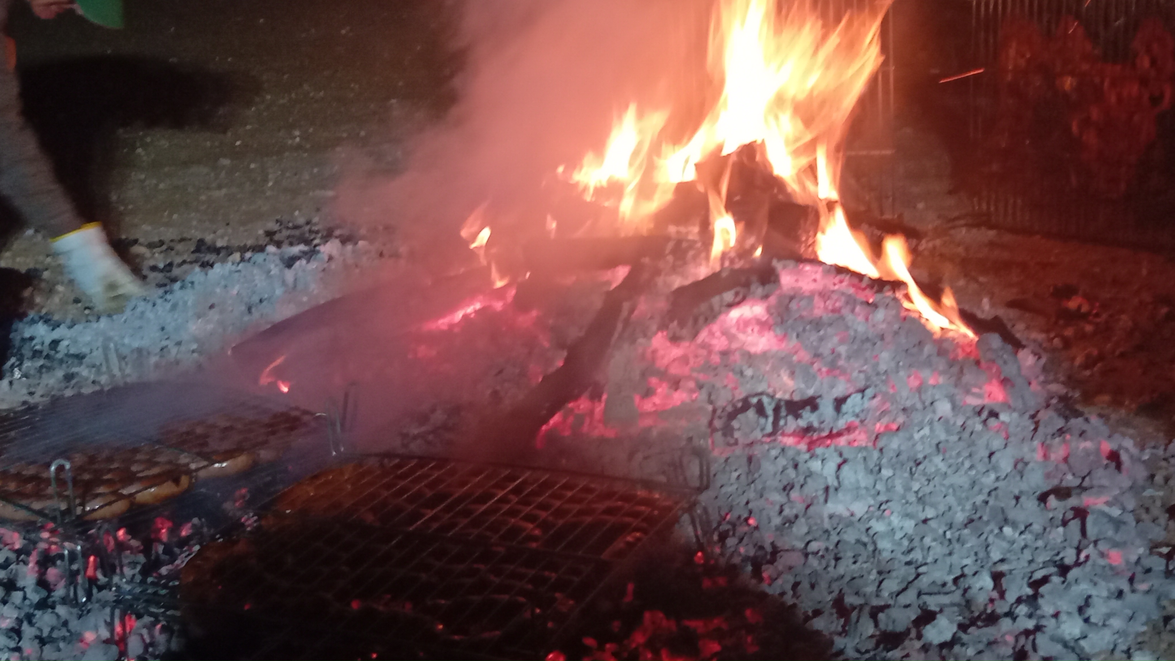 En un ambiente de camaradería, e impabidos al frío y al agua nieve, junto a la hoguera se degustó panceta, longaniza, chorizo, morcilla regados de buenos tintos. Todo gracias al esfuerzo de un grupo de socios que prepararon la leña, las brasas, y toda la logística necesaria, bajo la dirección de Fina Monleón.