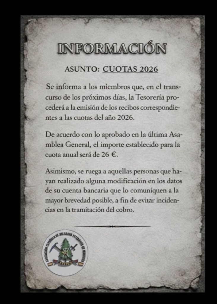 El Tesorero Nacional nos anuncia el próximo paso del cargo en CC de la cuota de socio correspondiente al ejercicio 2026, solicitando que si alguién a cambiado su cuenta lo comunique a la mayor brevedad posible para evitar devoluciones de las cuotas afectadas.