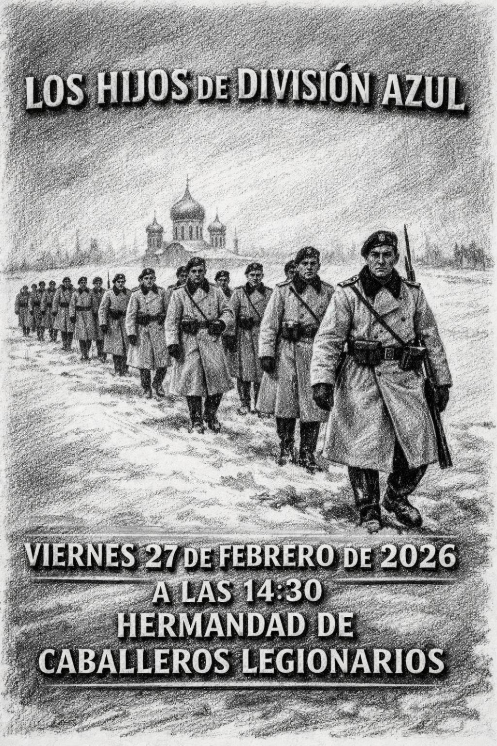Nuestros amigos y compañeros de Madrid organizan para el próximo 27 de febrero una mesa-coloquio en la que se hablará de la participación de la División Azul en la II Guerra Mundial en el frente ruso. Como se indica en su cartel anunciador no pretenden dar una clase magistral, sino compartir el legado que algunos de los socios de las Asociaciones de Veteranos de Montaña y de La Legión de Madrid han recibido directamente de sus padres, que participaron en dicha contienda como miembros de dicha Gran Unidad que, por encima de cualquier otra consideración, despertó la admiración de ambos bandos contendientes, por su valentía, arrojo y respeto por el adversario.