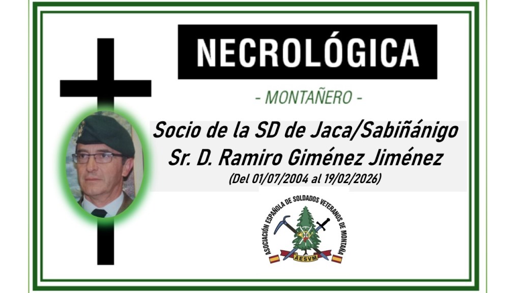 Ha fallecido nuestro compañero de la asociación de la Sección Delegada de Jaca/Sabiñánigo, barcelonés de nacimiento y zaragozano de adopción, Ilmo. Sr. D. Ramiro Giménez Jiménez, Coronel de Infantería D.E.M. en situación de retirado.