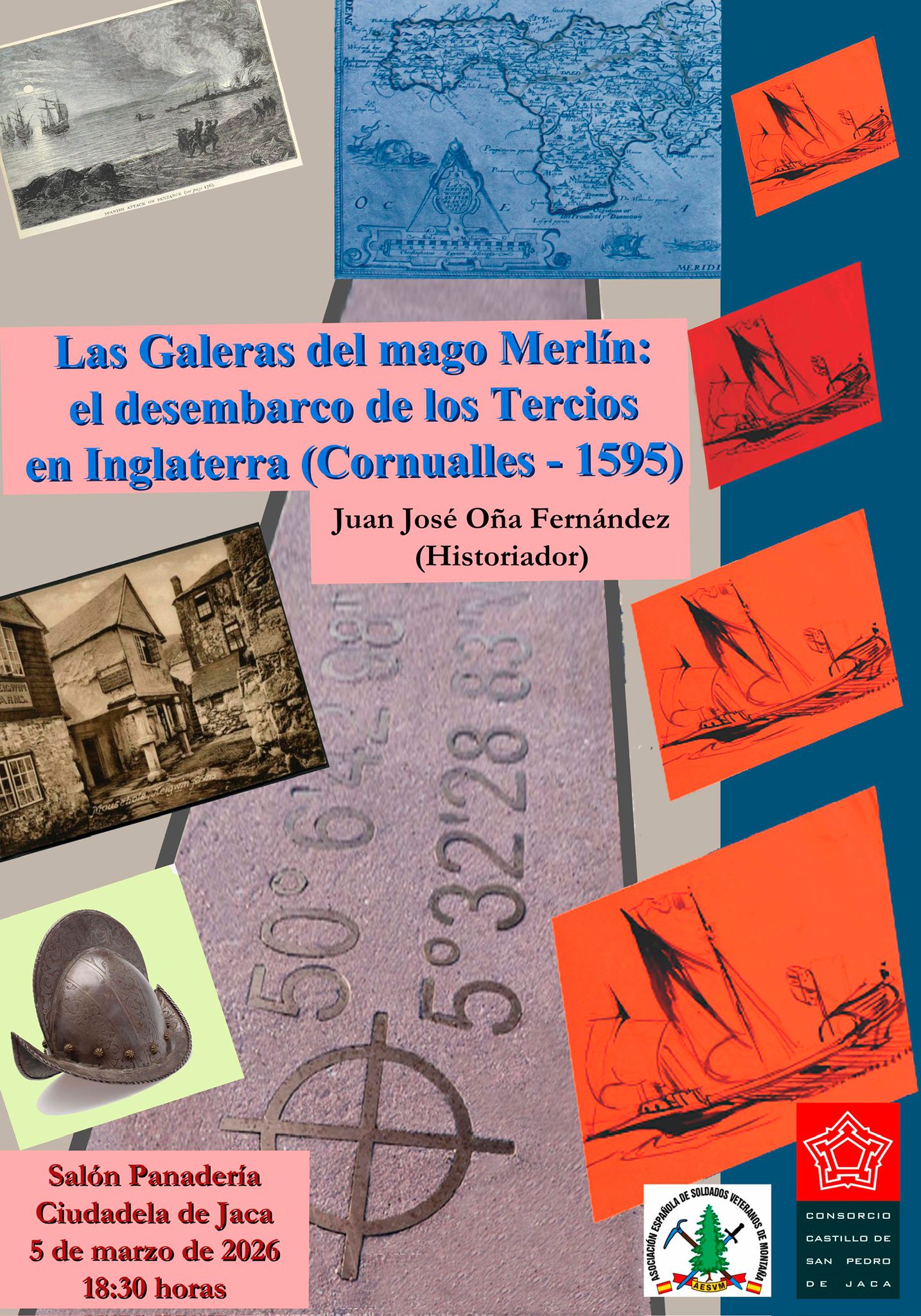 El pasado jueves, 5 de marzo, en el Salon de Panadería de la Ciudadela de Jaca, y organizada por la Sección Delegada de Jaca/Sabiñánigo en colaboración con el Consorcio del Castillo de San Pedro, se celebró la conferencia «Las Galeras del Mago Merlín; el Desembarco de los Tercios en Inglaterra (Corcualles 1595)» , impartida por nuestro compañero de Sección e Historiador, D. Juan José Oña, quién de una manera amena nos describió las circunstancias políticas y militares de dicha expedición.