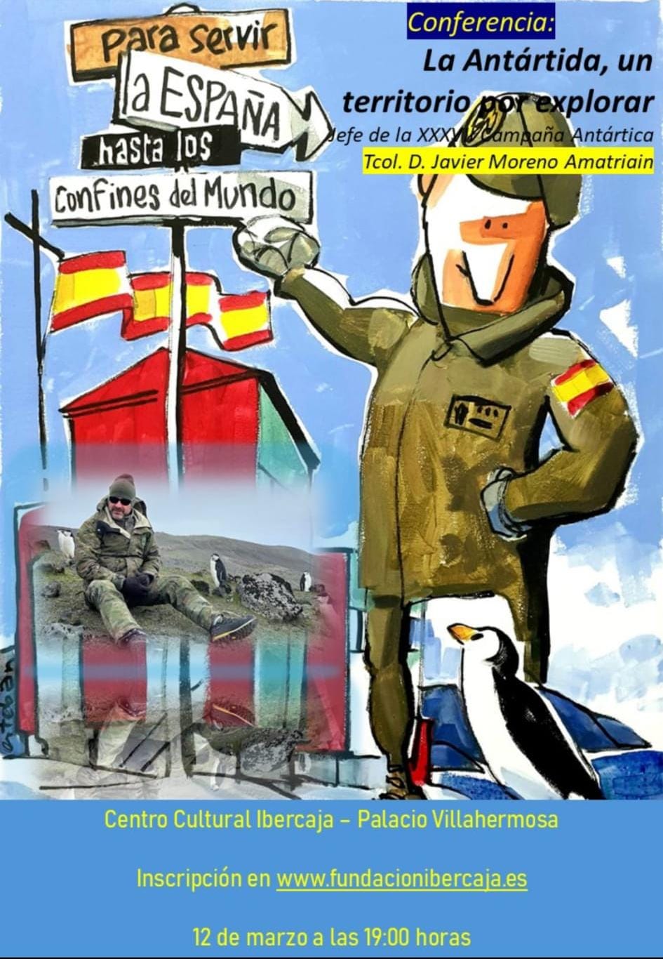 El próximo jueves, 12 de marzo a las 19:00 h, en el Centro Cultural Ibercaja, sito en el Palacio de Villahermosa de Huesca, tendrá lugar la conferencia «La Antártida, un territorio por explorar», a cargo del Teniente Coronel D. Javier Moreno Amatriain, Jefe de la XXXVIII Campaña Antártida Española.