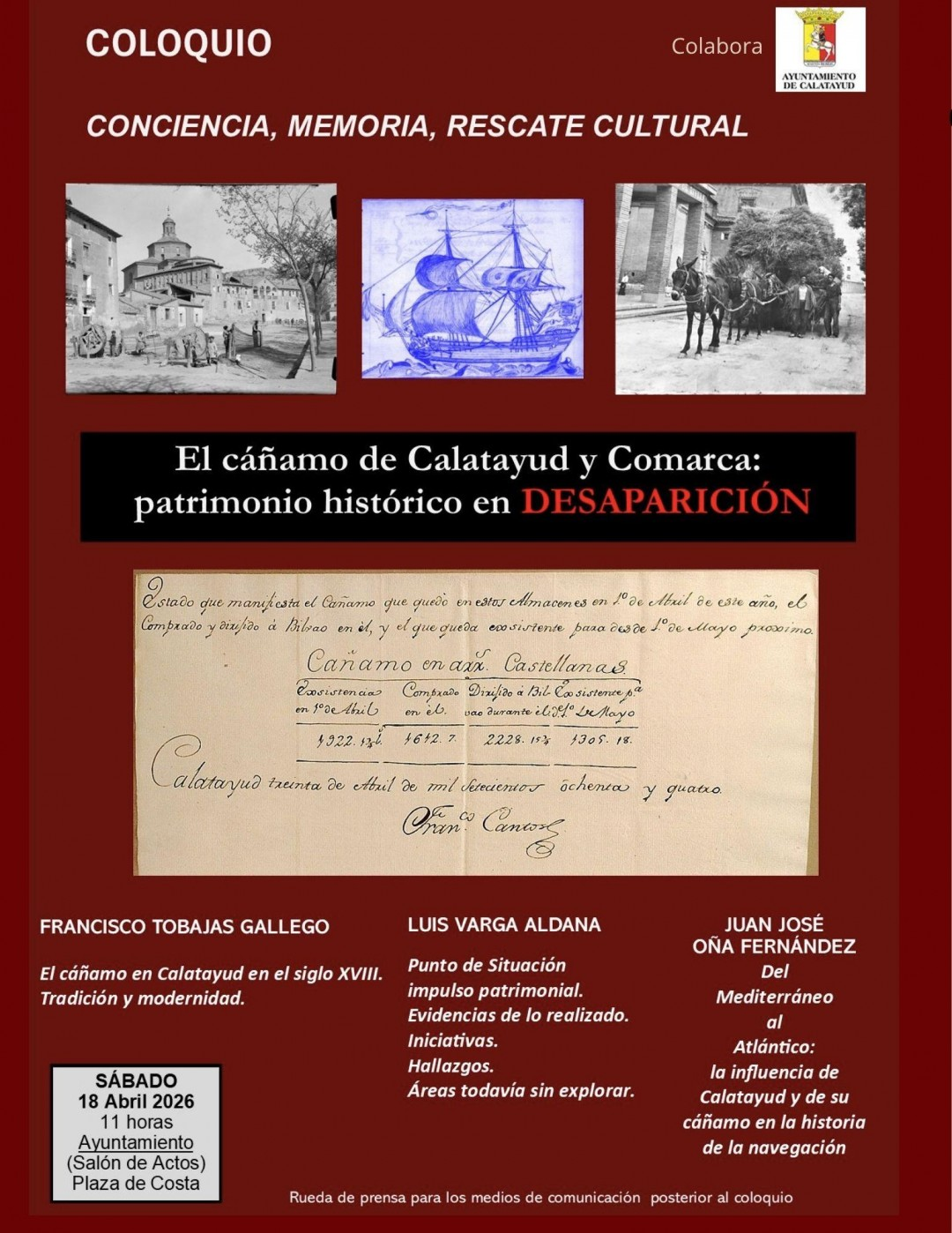 El peóximo 18 de abrul tendrá lugar en el Salón de Actos del Ayuntamiento de Calatayud la Mesa-Coloquio sobre «El Cáñamo de Calatayud y Comarca: Patrimonio histórico en Desaparición», en la que intervendrá como ponente nuestro compañero de la Sección Delegada de Jaca/Sabiñánigo D. Juan José Oña Fernández, con la ponencia «Del Mediterráneo al Atalántico: la influencia de Calatayud y de su cáñamo en la historia de la navegación».
