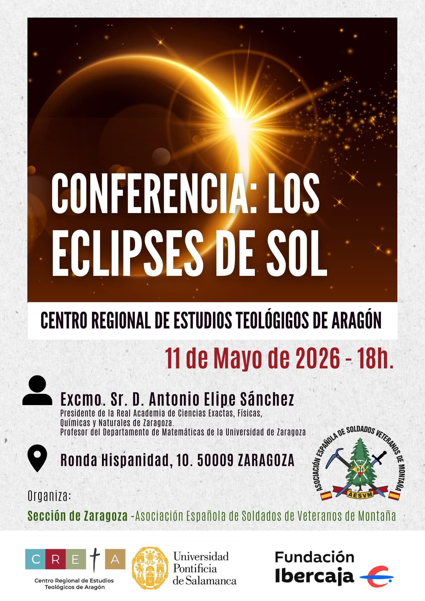 Nuestros compañeros de la Sección Delegada de Zaragoza h aprogramado para el 11 de mayo una interesante conferencia: «Los Eclipes de Sol», que será impartida en el Centro Regional de Estudios Teológicos de Aragón por parte de nuestro socio de dicha Sección D. ANTONIO ELICES SÁNCHEZ, que es Presidente de la Real Academia de Ciencias Exactas, Físicas, Químicas y Naturales de Zaragoza y profesor del Departamento de Matemáticas de la Universidad de Zaragoza.