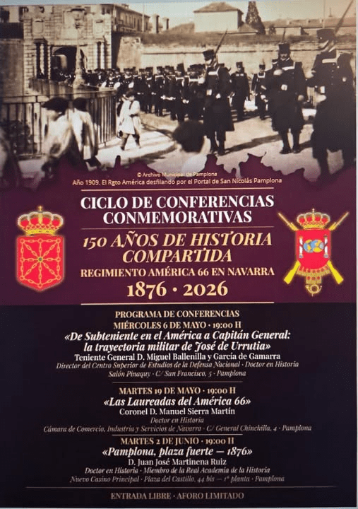 El Regimiento de Infantería de Cazadores de Montaña «América-66» celebra sus 150 años de permanencia en Pamplona (1876-2026) con un ciclo de conferencias muy interesantes, que tendrán lugar en las siguientes fechas: